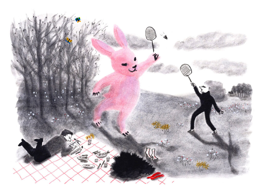 Graphite and gouache illustration. 3 characters are seated in a dark room. 2 women and a giant pink rabbit in the centre. They are having tea and eating biscuits.